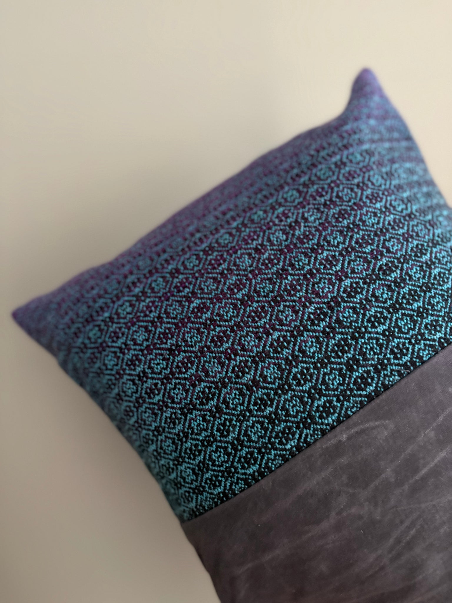 This throw pillow a wonderful statement piece for any space! The woven material features the full warp of Feminine Rage and a bright blue bamboo weft. It is paired with a waxed canvas backing.