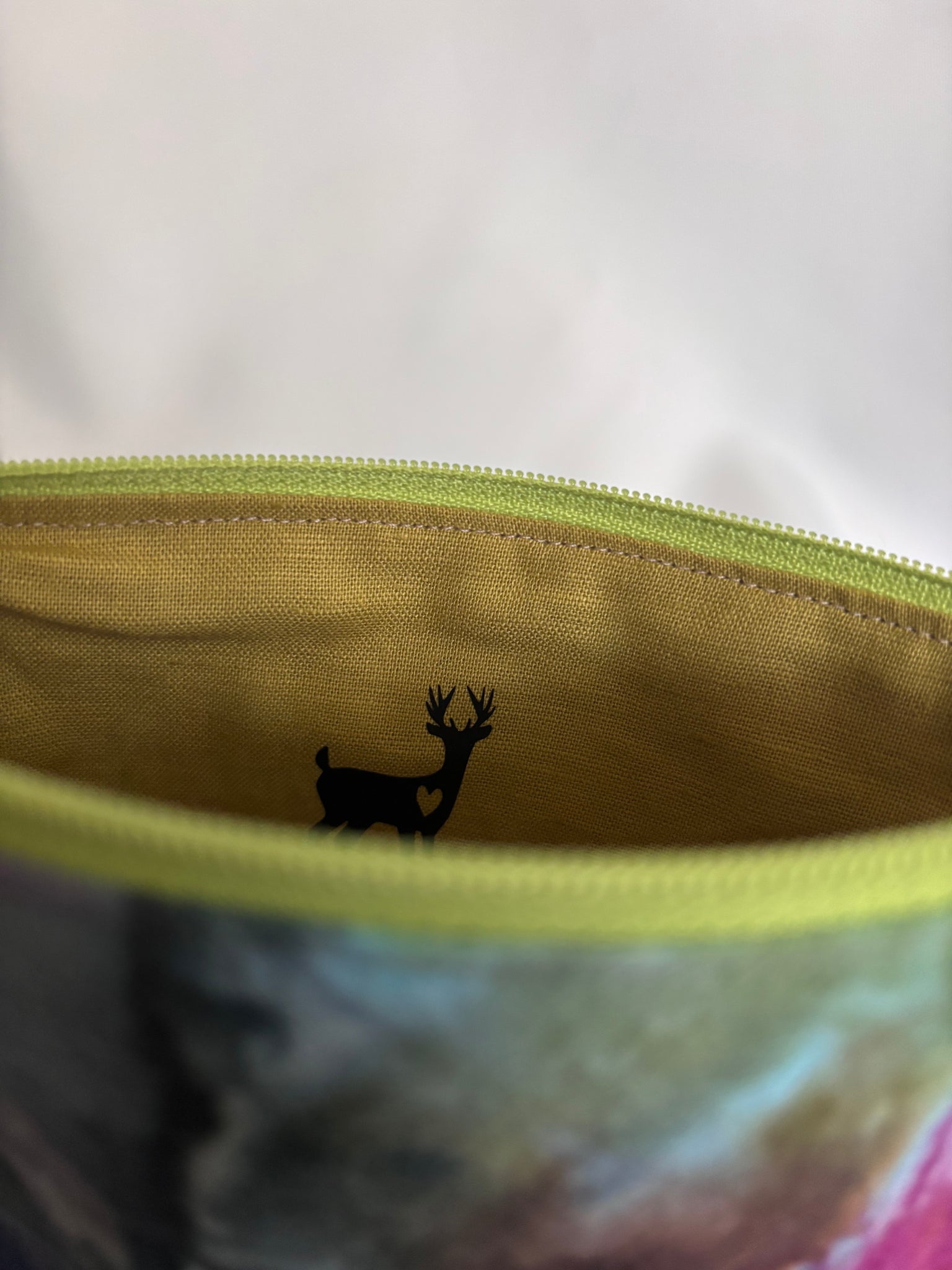 This little zipper pouch has an ice dyed cotton exterior, linen interior and zipper closure
